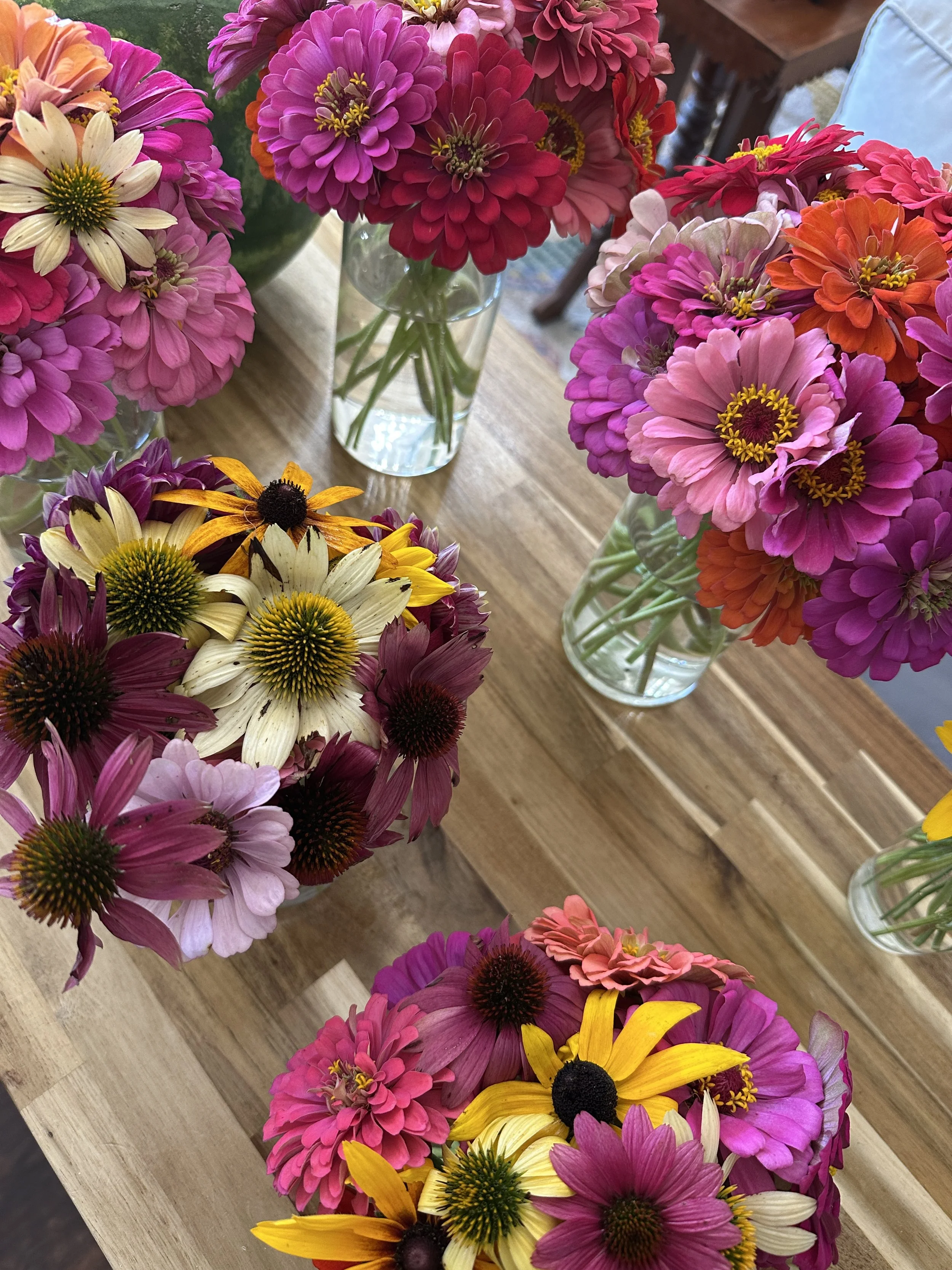 The farm team is happy to design and develop a custom collection of centerpieces and bouquets by request. We will pick from what is currently blooming on the farm, work with you to determine the color mix you prefer and provide finished designs. Delivery can be provided within the Triangle area. We book all custom work at least 2 months in advance. Email us to design your ideas.